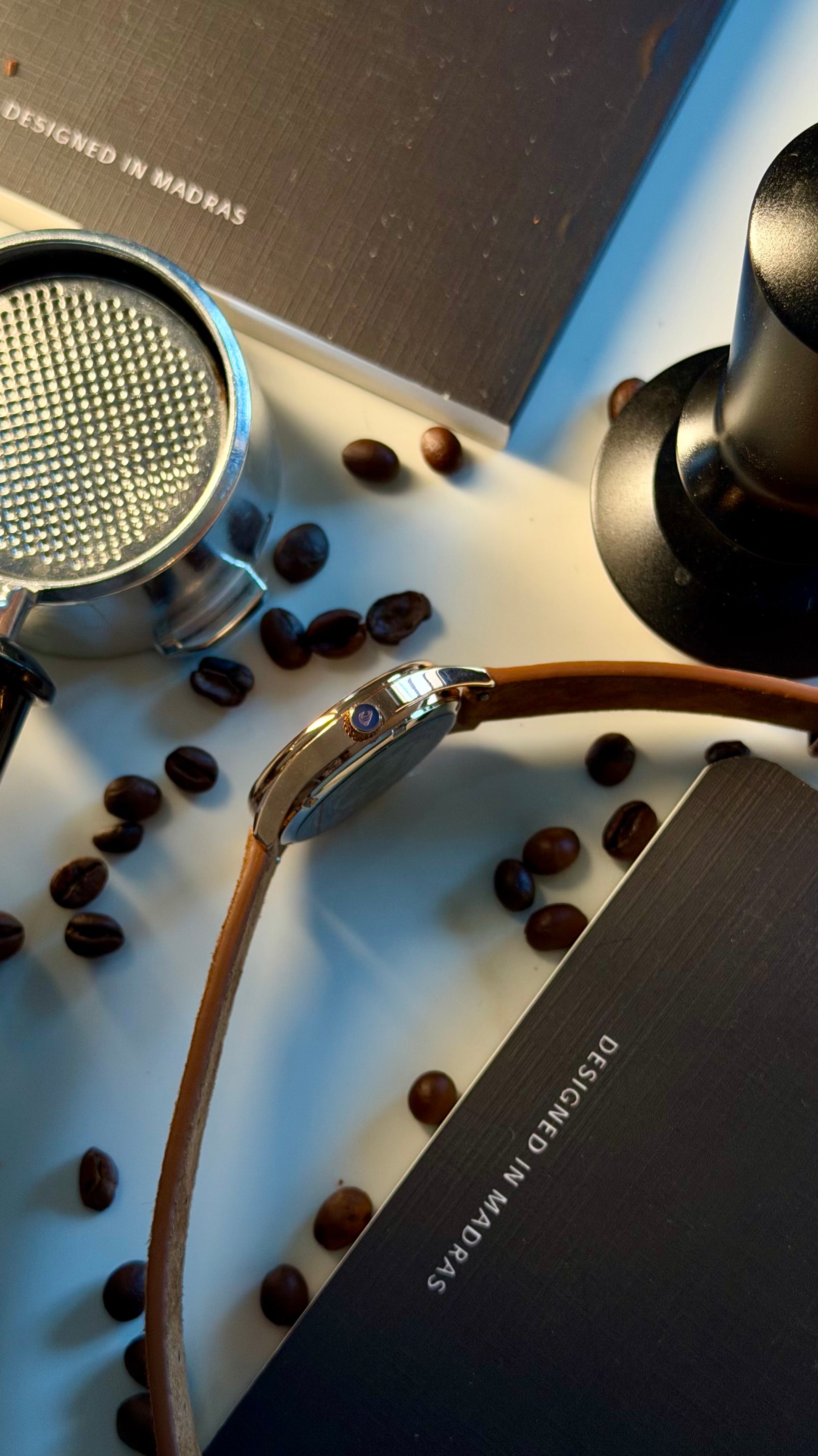Powered by a reliable Japanese GM12 quartz movement and paired with a soft suede leather strap, the Kaappi Edition is built for daily wear with 100 metres of water resistance.