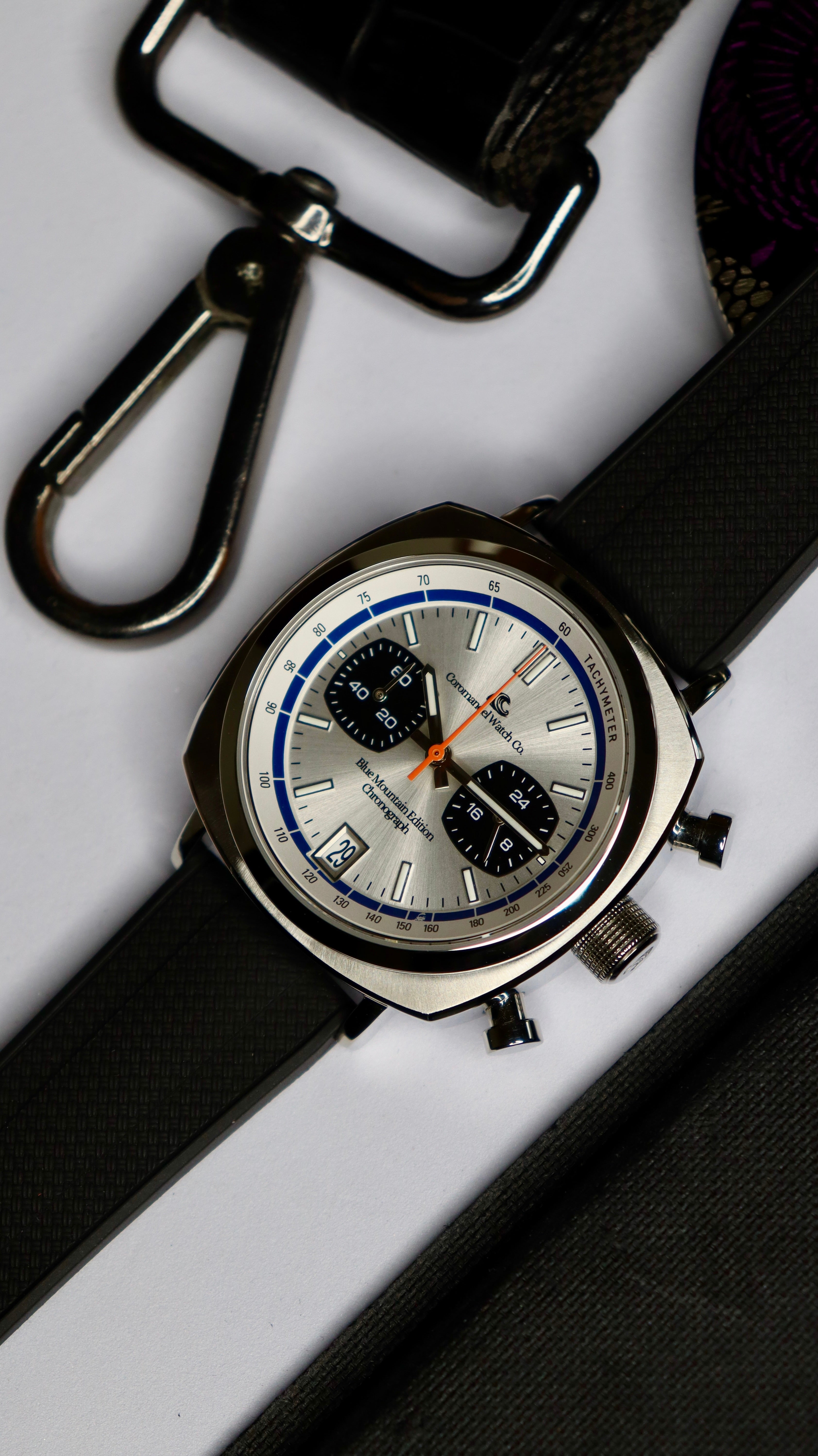 The Blue Mountain Edition Chronograph by Coromandel Watch Co. is a celebration of the Nilgiris, the "Blue Mountains" of South India, and its iconic mountain railways—one of the last remaining steam-powered trains in the world.